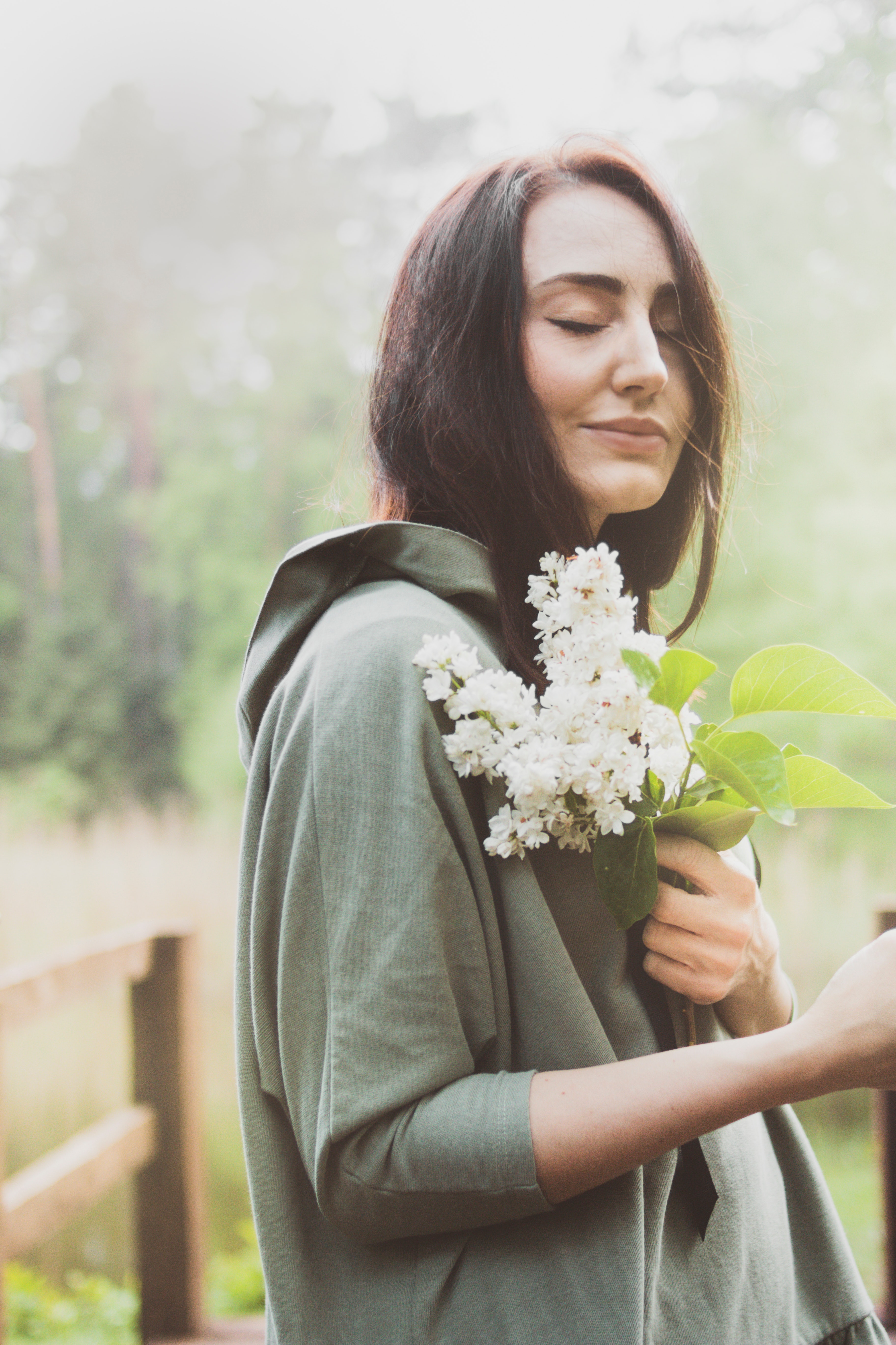 Morgan stands in a garden of white flowers, she smiles, appears appreciative. She reaches down, plucks a white flower, admires it.